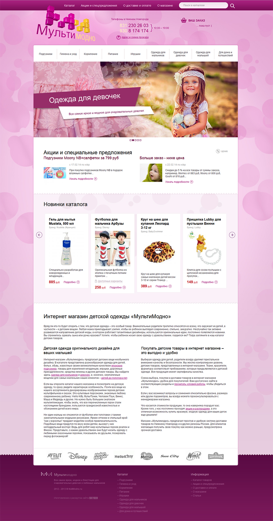 Интернет-магазин "Мультимодно" ориентирован на детей и их родителей. На сайте можно найти полное описание различных товаров и их качественные изображения. Товары распределены по категориям и подкатегориям, что делает поиск быстрым и удобным. Быстрому поиску способствует и удобная система фильтров, позволяющая подобрать товары по цене, новизне или бренду.
